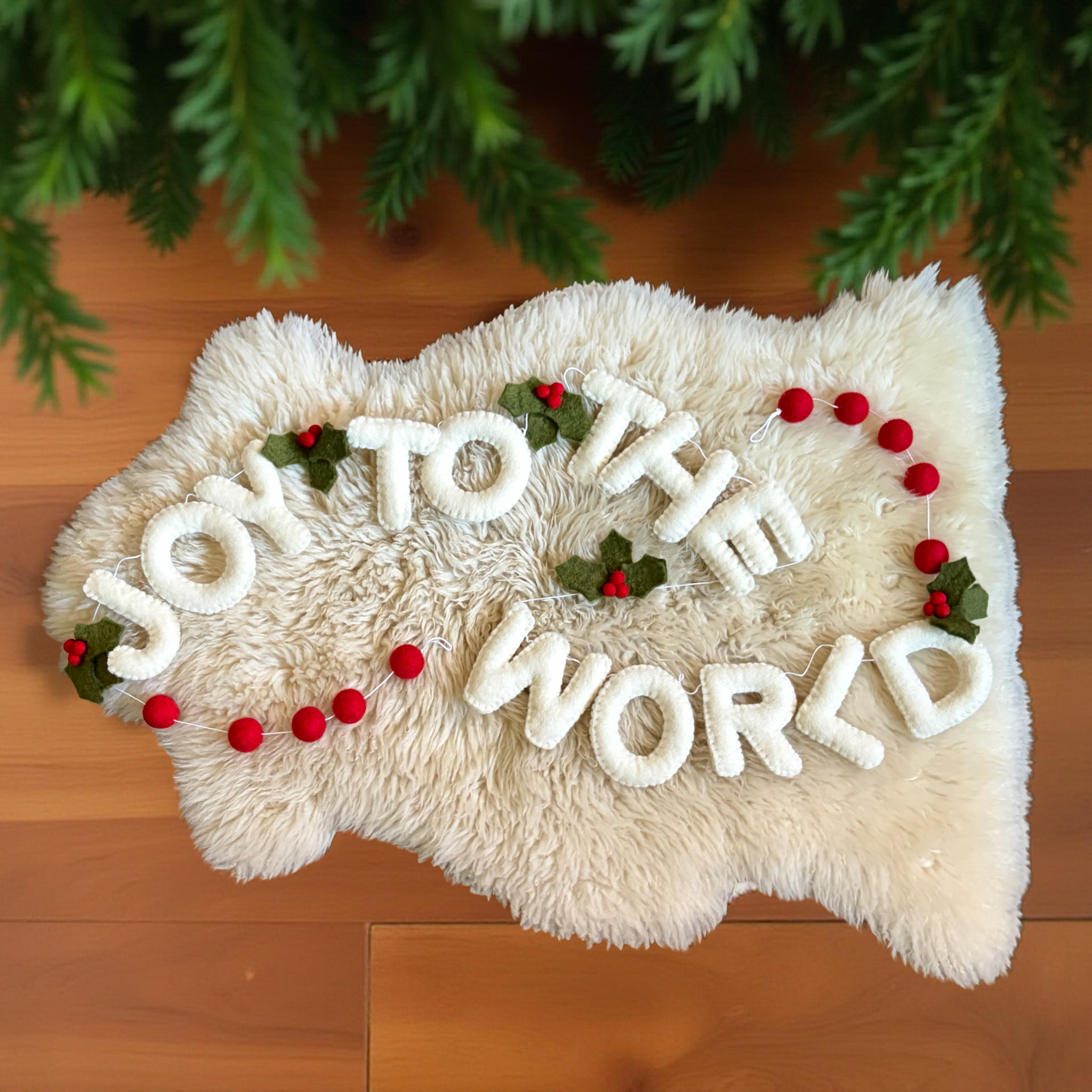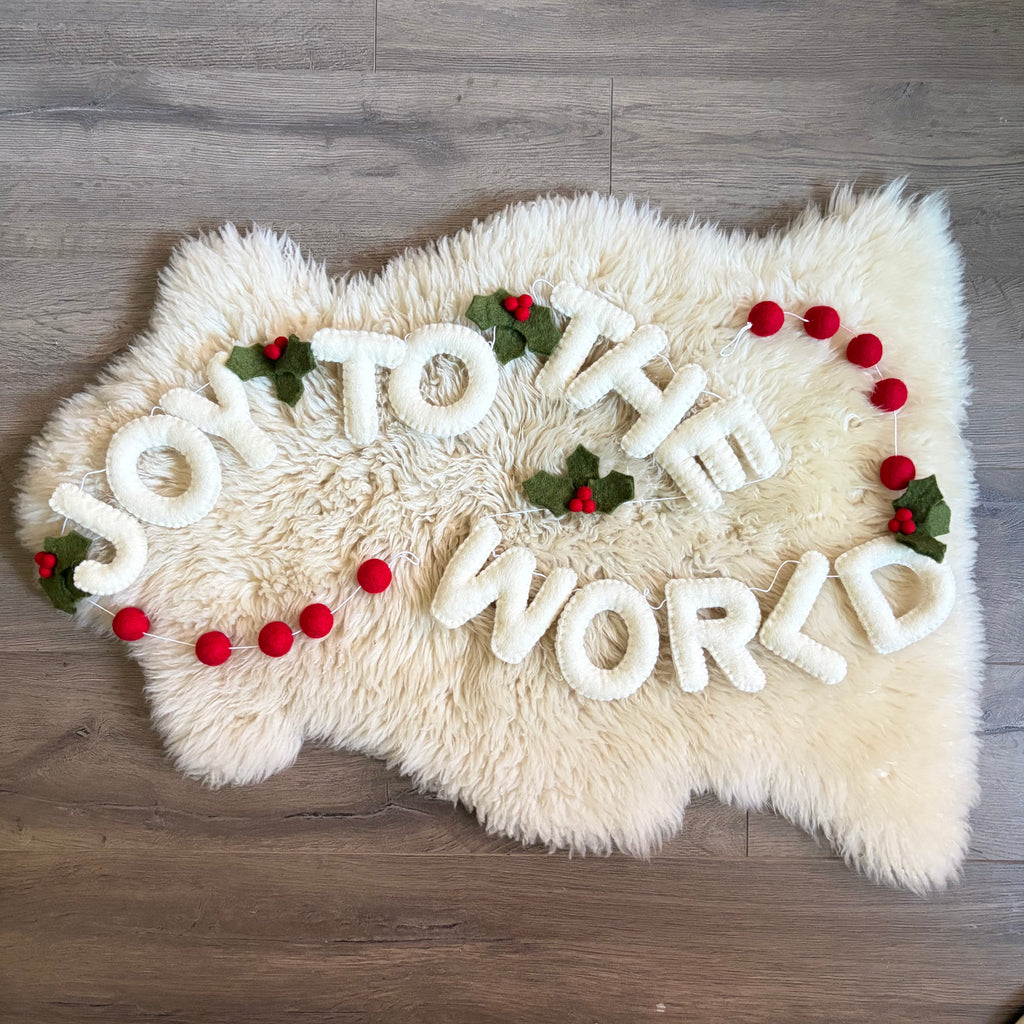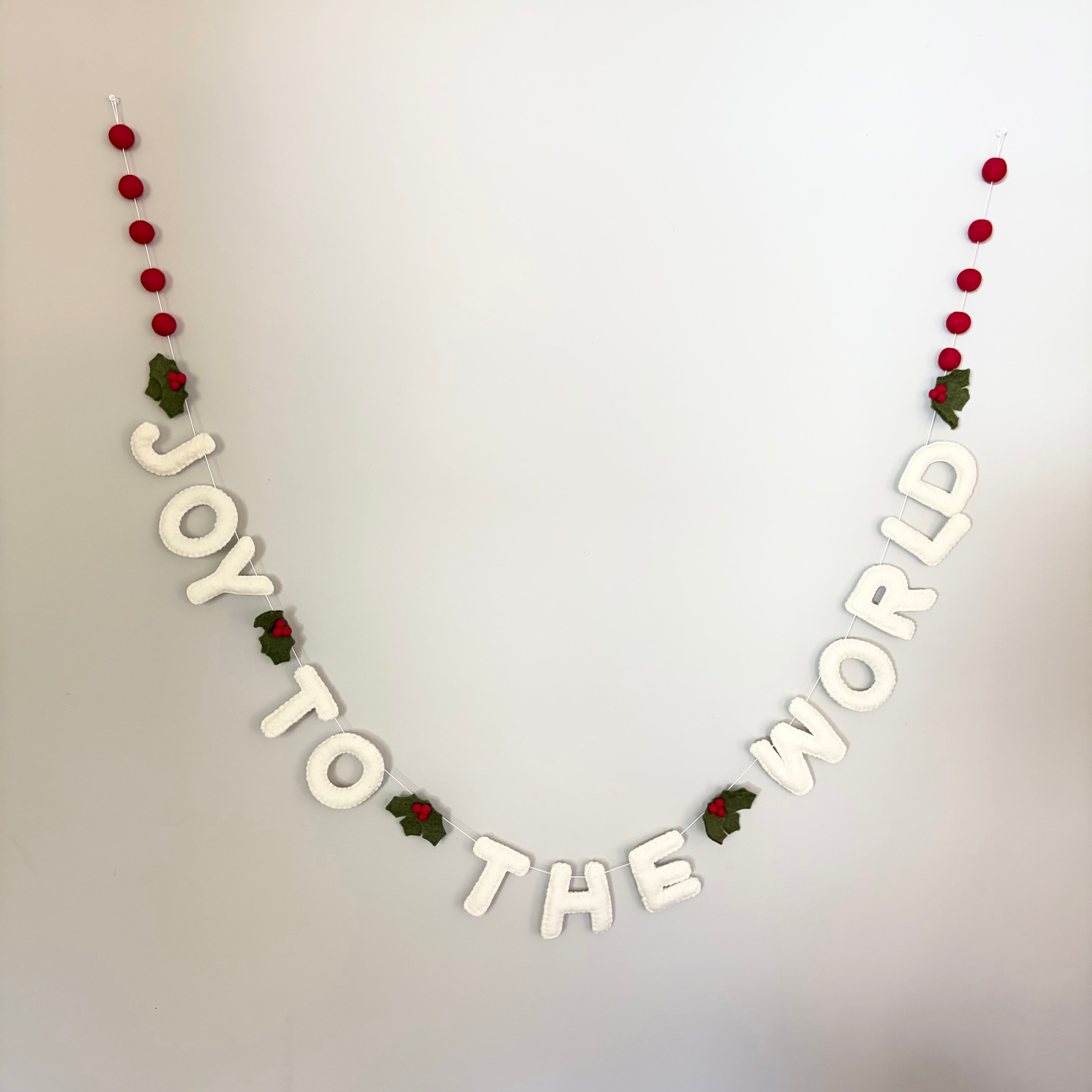 Celebrate the true meaning of Christmas with this timeless Joy to the World felt letter banner. Handcrafted with care, each letter is cut from soft white felt, hand stitched, and strung alongside felt holly leaves and bright red berries—symbolizing the joy and hope that Christmas brings.