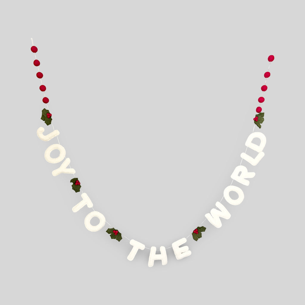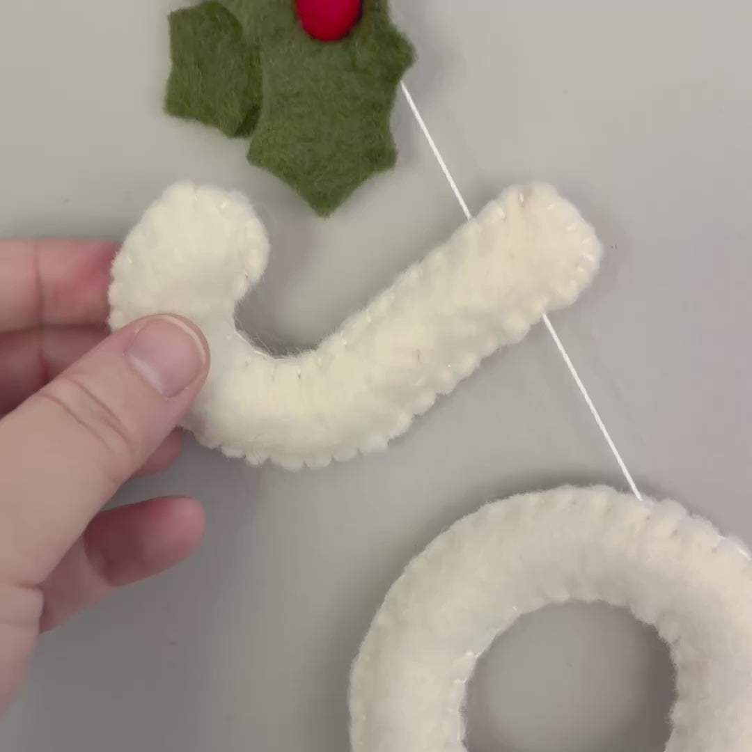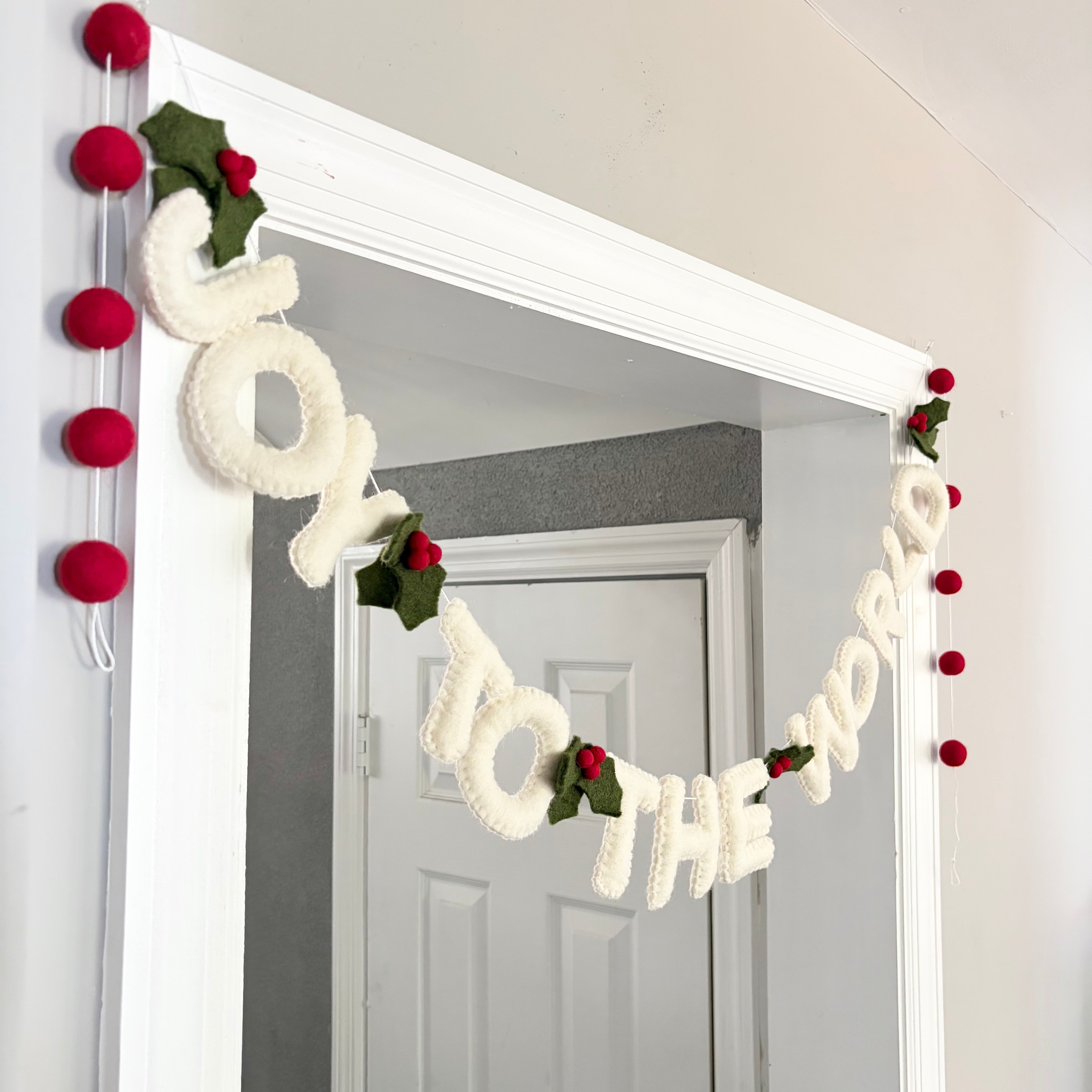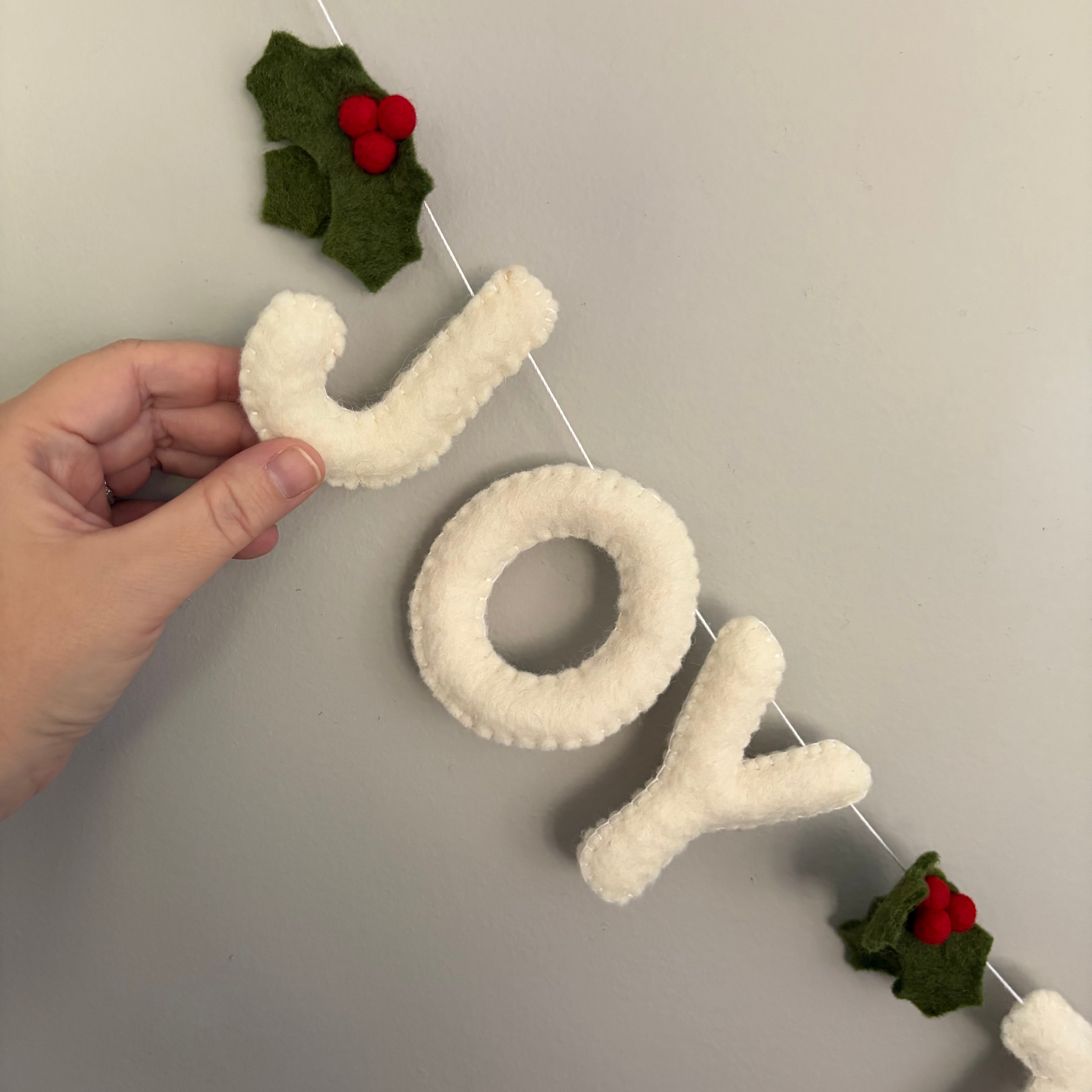 Celebrate the true meaning of Christmas with this timeless Joy to the World felt letter banner. Handcrafted with care, each letter is cut from soft white felt, hand stitched, and strung alongside felt holly leaves and bright red berries—symbolizing the joy and hope that Christmas brings.