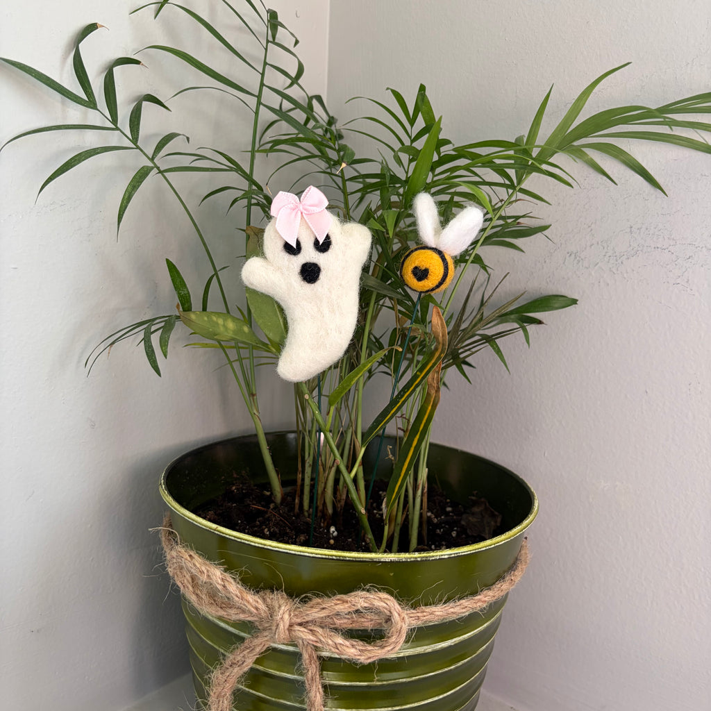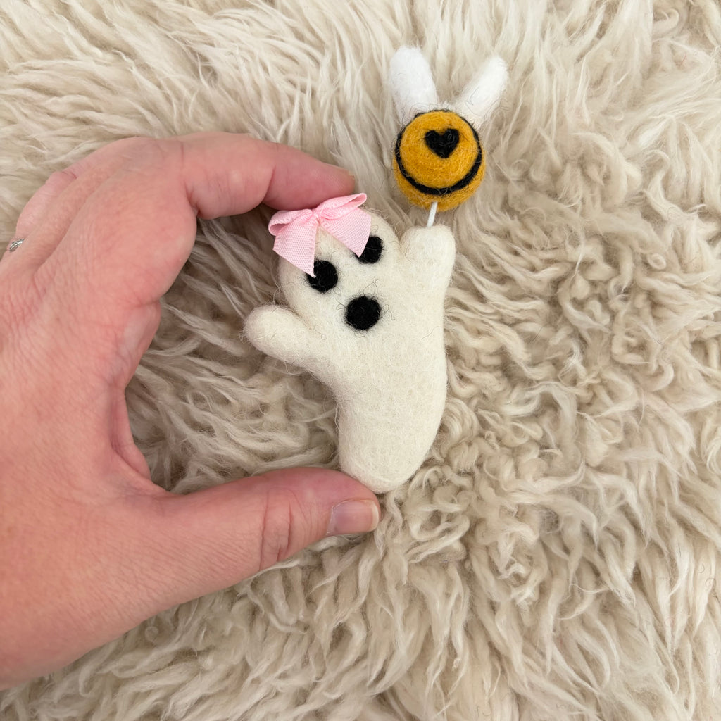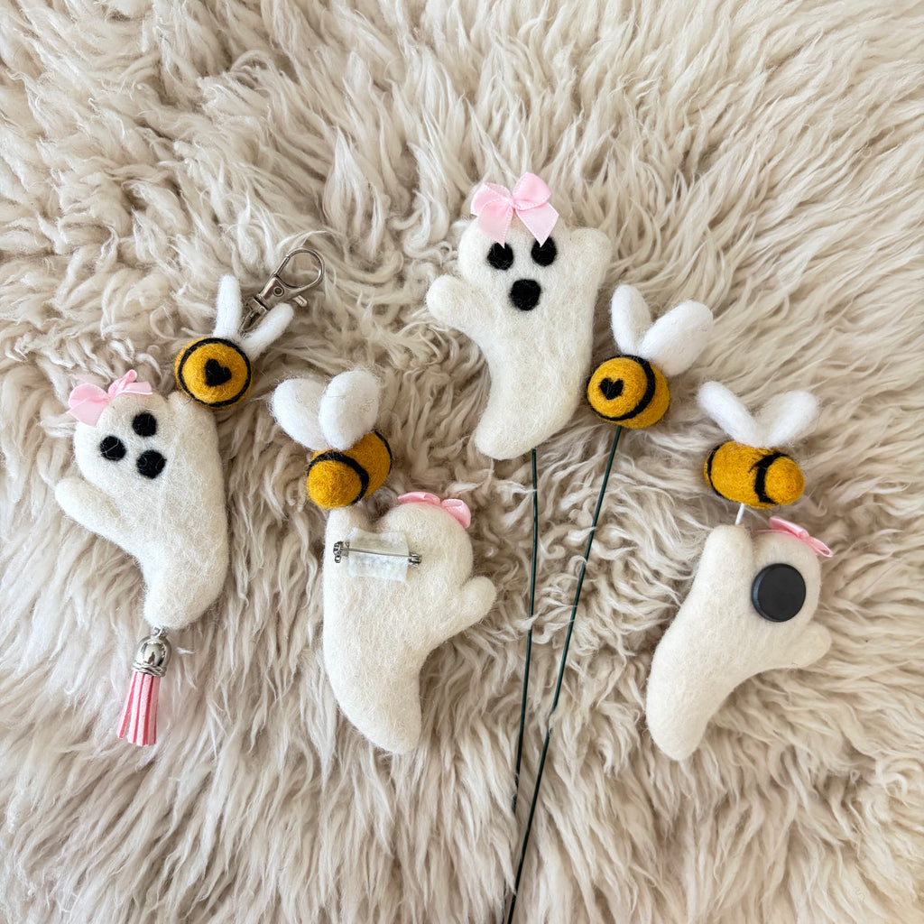 Show your spirit and spread the buzz about breast cancer awareness this October! This little ghost with a pink ribbon holds onto his bee friend for support. It's a great way to start up a conversation about this great cause!